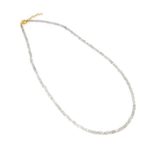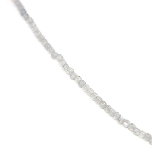Κολιέ με ψιλές πολύτιμες χάντρες από Labradorite κομμένες σε κυβάκι ~2.5mm. Το κολιέ έχει μήκος 40+3cm με ασημένιο Ag925° κούμπωμα.